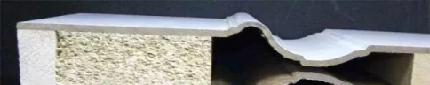 模壓門從截面就能一眼看出框架優(yōu)劣。像下圖的這個(gè)框架就是實(shí)木廢物碾碎膠粘而成,用料相當(dāng)差。面板層覆了一層幾乎能夠忽視不計(jì)的PVC膜