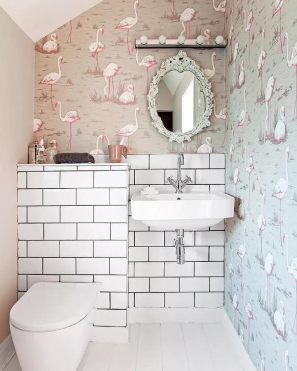 漂亮的鏡子、燈光和配飾增添了女性風(fēng)格,而帶有深色灌漿的地鐵瓷磚則平衡了外觀。一旦時(shí)尚改變了這個(gè)小空間,只需幾卷新壁紙即可輕松更新,以獲得全新的外觀。
