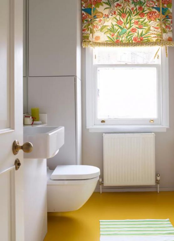 誰說拼色只是為了時(shí)尚?在這個(gè)小衣帽間里也很有效。簡潔是關(guān)鍵,引人注目的黃色地板從白色背景和浴室套房中突顯出來
