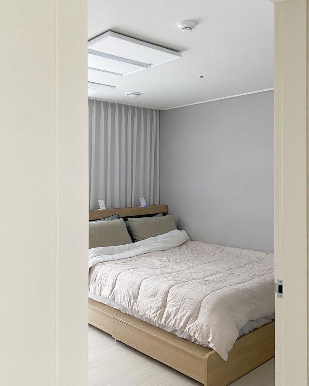 主臥空間適合大人居住,還是喜歡這種簡(jiǎn)單舒適的布局?;疑膲γ娲钆浠疑拇昂?。木質(zhì)床鋪配上棉質(zhì)床單,看起來(lái)非常干凈。難怪別人都說(shuō)再過10年也是流行。