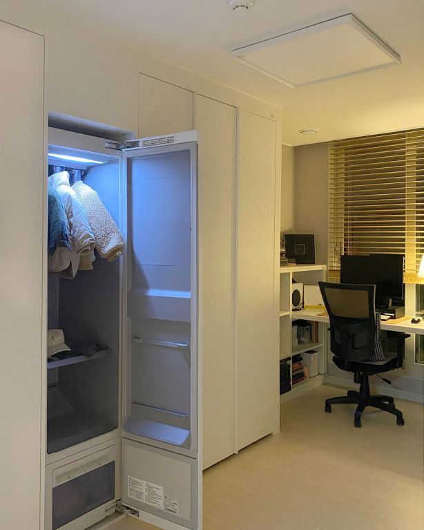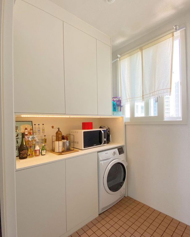 陽(yáng)臺(tái)空間被改成了洗衣房使用,利用側(cè)邊打造到頂?shù)墓耋w,可以嵌入洗衣機(jī)、烘干機(jī)等物品。吊柜側(cè)邊留空一部分,還可以把洗衣液通通塞進(jìn)去。