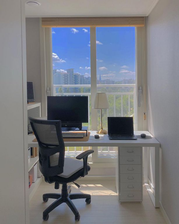 書房空間其實(shí)很小,所以選擇和衣帽間結(jié)合。靠窗不到2㎡的一小部分空間放置書桌和柜體,平時(shí)大人可以在這里辦公,白天享受最好的光線和最美的窗外風(fēng)景,完善拉上百褶窗,又能給予自己靜謐且隱私的空間。