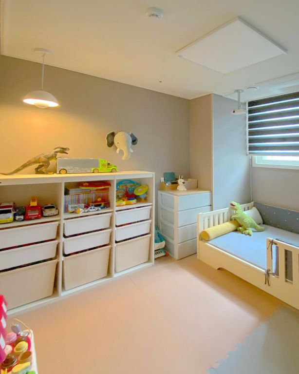 目前孩子還小,所以只在拐角安排一個(gè)超小的迷你床,足夠孩子一個(gè)人使用了。其他空間拿牌柜體存放孩子的書籍和玩具,給孩子更多的活動(dòng)空間。