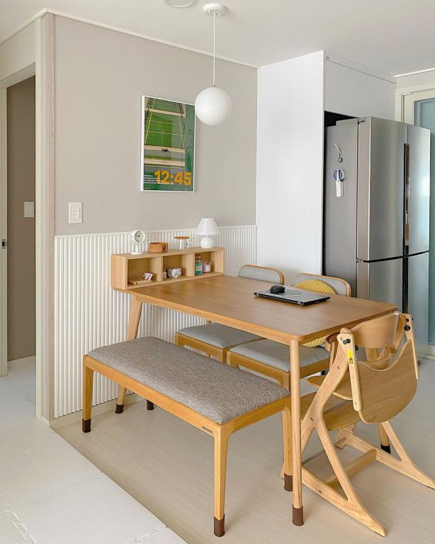 餐廳布局你們可以學(xué)習(xí),乍一看沒有什么復(fù)雜的,但是實(shí)用性藏在小細(xì)節(jié)里。比如餐桌邊墻面下方鋪貼護(hù)墻,防濺油防濺水,有效保護(hù)墻面。餐桌上方還擺放了一個(gè)開放式的置物架,可以存放一些小雜物,拿取方便。