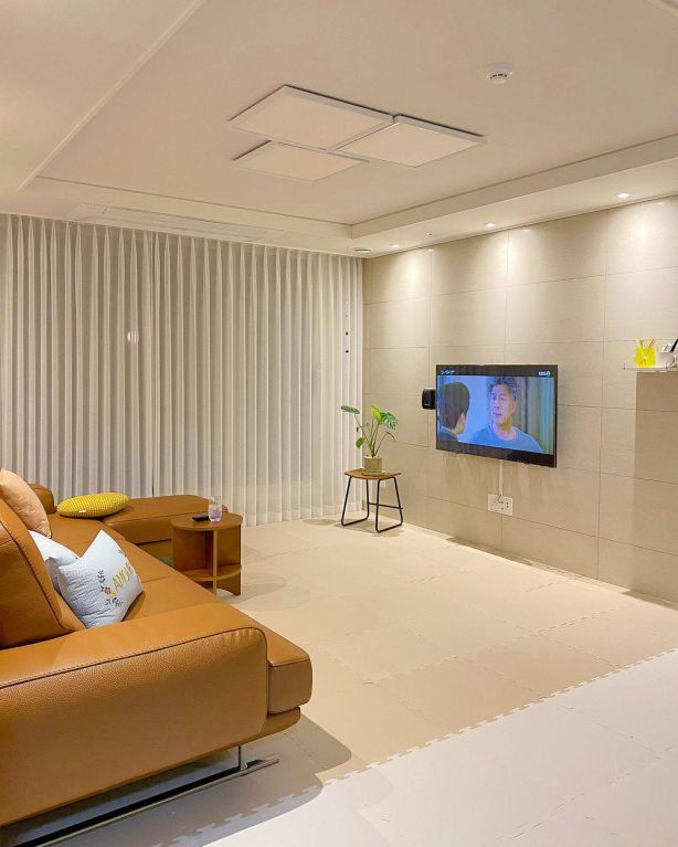 客廳空間比較簡(jiǎn)單,沒有多少物品,只有簡(jiǎn)單的電視、沙發(fā)和茶幾布局,東西越少反而顯得更加精致。深橘色沙發(fā)和暖色系的瓷磚搭配,又復(fù)古又干凈。摒棄滿墻柜體,掛放電視,并給旁邊墻面安排一個(gè)置物架就搞定。