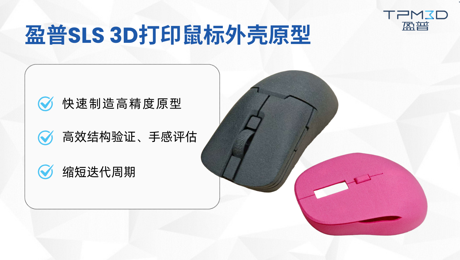 盈普幫助外設(shè)品牌在設(shè)計人體工學鼠標時,外殼形狀普遍曲面變化豐富。利用盈普SLS 3D打印機快速制造出高精度原型,設(shè)計師能在極短時間內(nèi)進行多輪手感評估、結(jié)構(gòu)裝配驗證(測試內(nèi)部PCB板、按鍵結(jié)構(gòu)配合度)以及用戶焦點小組測試,將外形設(shè)計迭代周期縮短數(shù)倍,大幅加速產(chǎn)品上市。