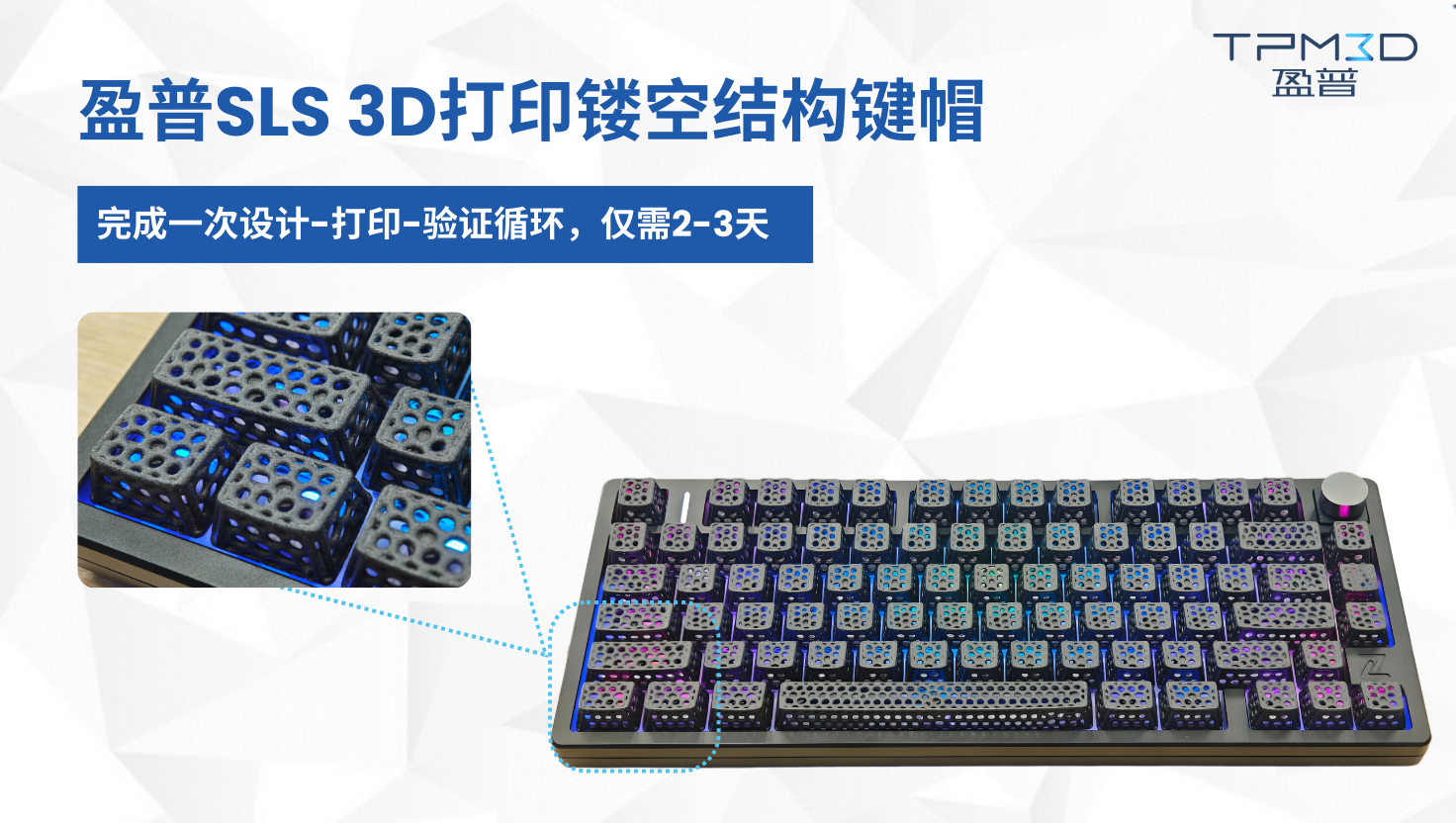 同時尼龍材料本身具有良好的強度和耐用性,成功驗證了光影效果和耐用性,搭配化學整齊平滑后處理工藝,鍵帽表面光滑疏水且親膚,可以作為實際產(chǎn)品使用。使用3D打印來進行設(shè)計迭代,僅需2-3天就可完成一次設(shè)計-打印-驗證的循環(huán),相比傳統(tǒng)的即使非鏤空設(shè)計鍵帽也要提高迭代速度近70%,大幅加速研發(fā)進度。