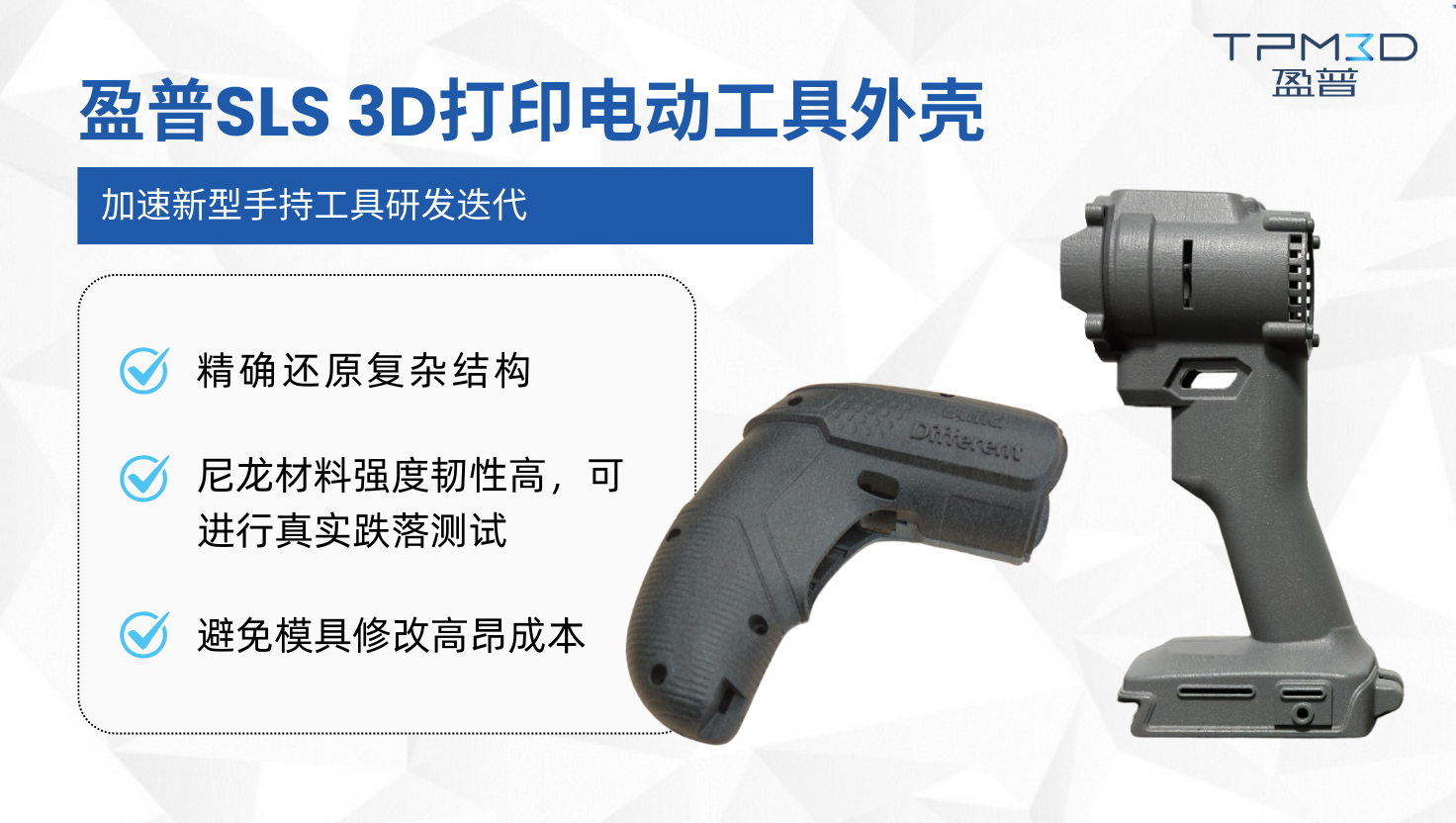 某電動工具廠商開發(fā)新型手持工具,外殼需集成復(fù)雜內(nèi)部結(jié)構(gòu)(散熱風道、電池倉卡扣、防摔筋),且需承受一定沖擊。盈普SLS打印的功能原型不僅精確還原了復(fù)雜結(jié)構(gòu),其尼龍材料的強度和韌性使得工程師能進行真實的跌落測試和握持感評估,快速優(yōu)化結(jié)構(gòu)設(shè)計,避免了后期模具修改的高昂成本。